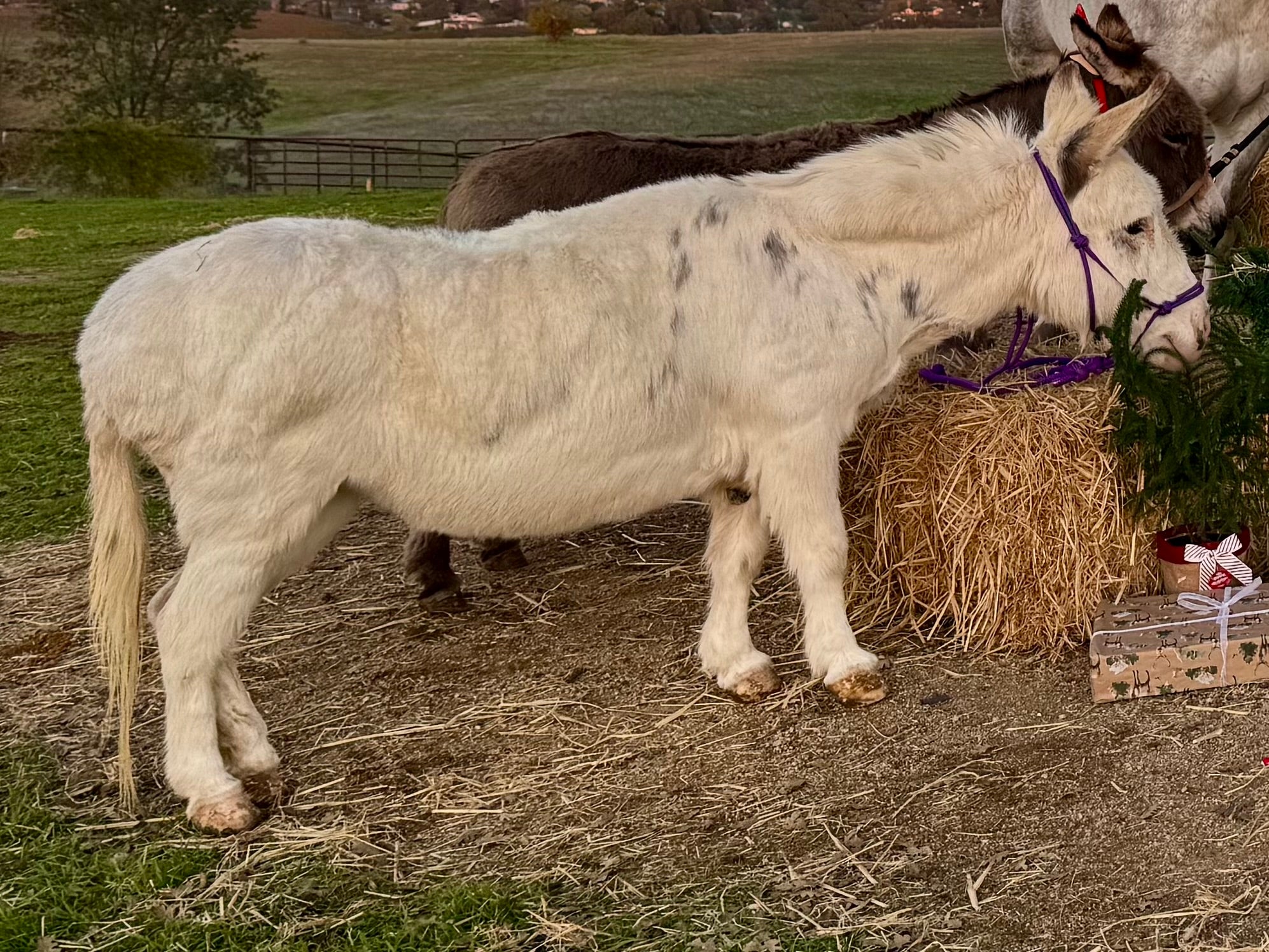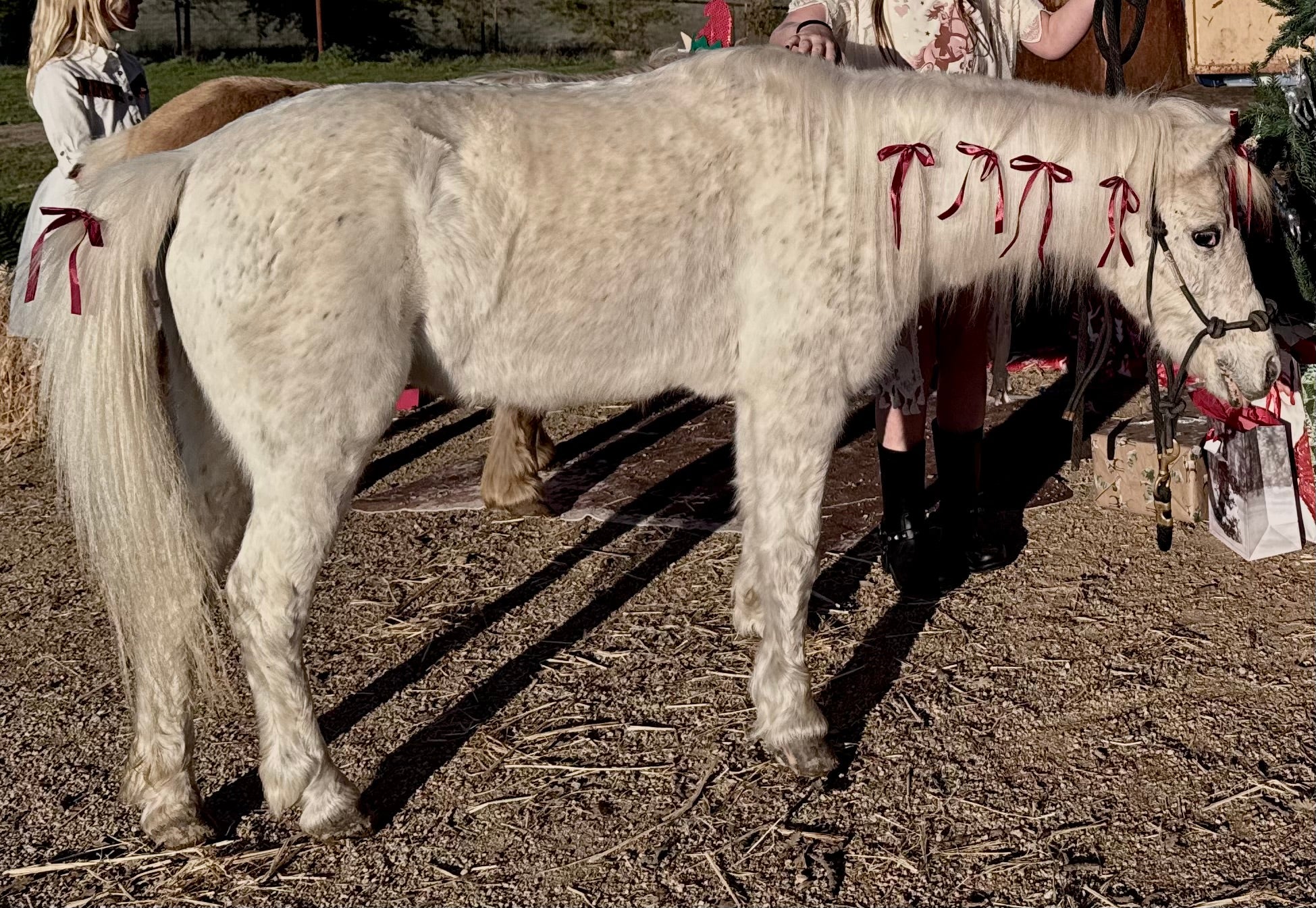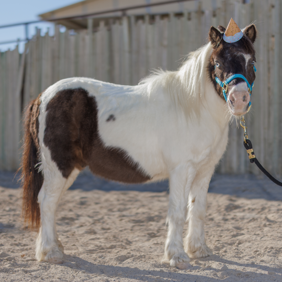 Meet Pearl, our white mini donkey who has spent the last 15 years living her best retired-pasture-princess life-grazing, napping, and giving exactly zero apologies for her delightful little streak of sass. Now in her early 20s, Pearl has decided she’s ready for a comeback tour! She’s joining our pony parties as the resident “celebrity donkey,” offering just enough affection to win your heart…and just enough attitude to keep you humble. With her wise eyes, fluffy ears, and perfectly unimpressed expressions, Pearl is guaranteed to steal every photo-and maybe your snacks if you’re not paying attention.